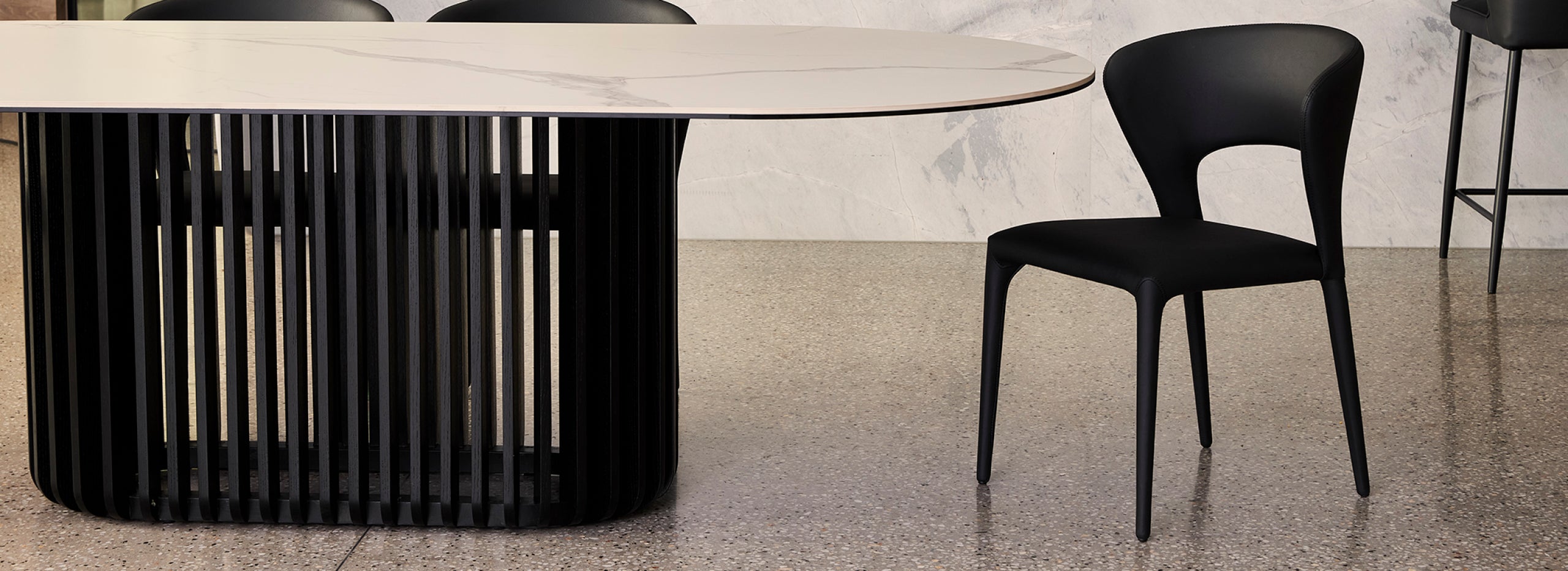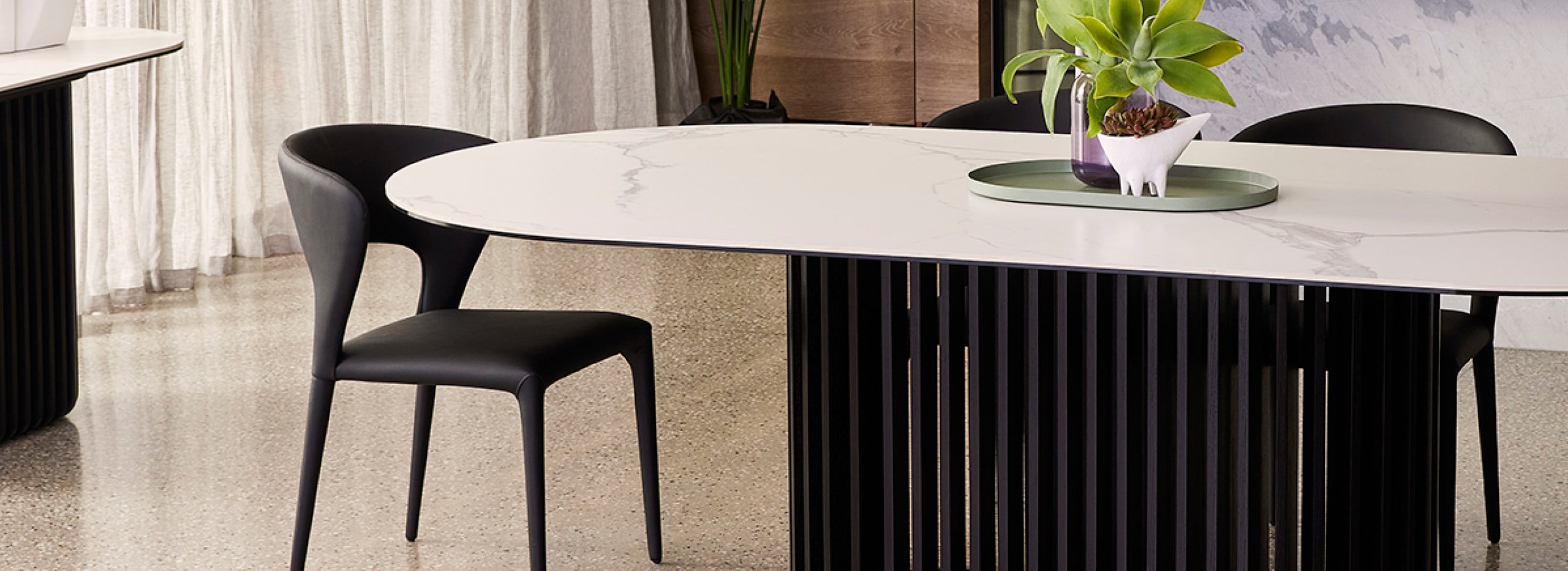 The Bobo collection reinvent s mid-century modern with crisp, contemporary flair. Centered around an oval silhouette, each design marries a pristine matt white ceramic surface with a slatted black oak timber base—creating a sculptural yet functional aesthetic. Composed exclusively for Adriatic, it includes standout pieces like the dining table, coffee table, and buffet—each exuding refined visual interest and timeless character. Built for longevity and delivered with installation, every Bobo piece is backed by Adriatic’s two-year peace-of-mind warranty.