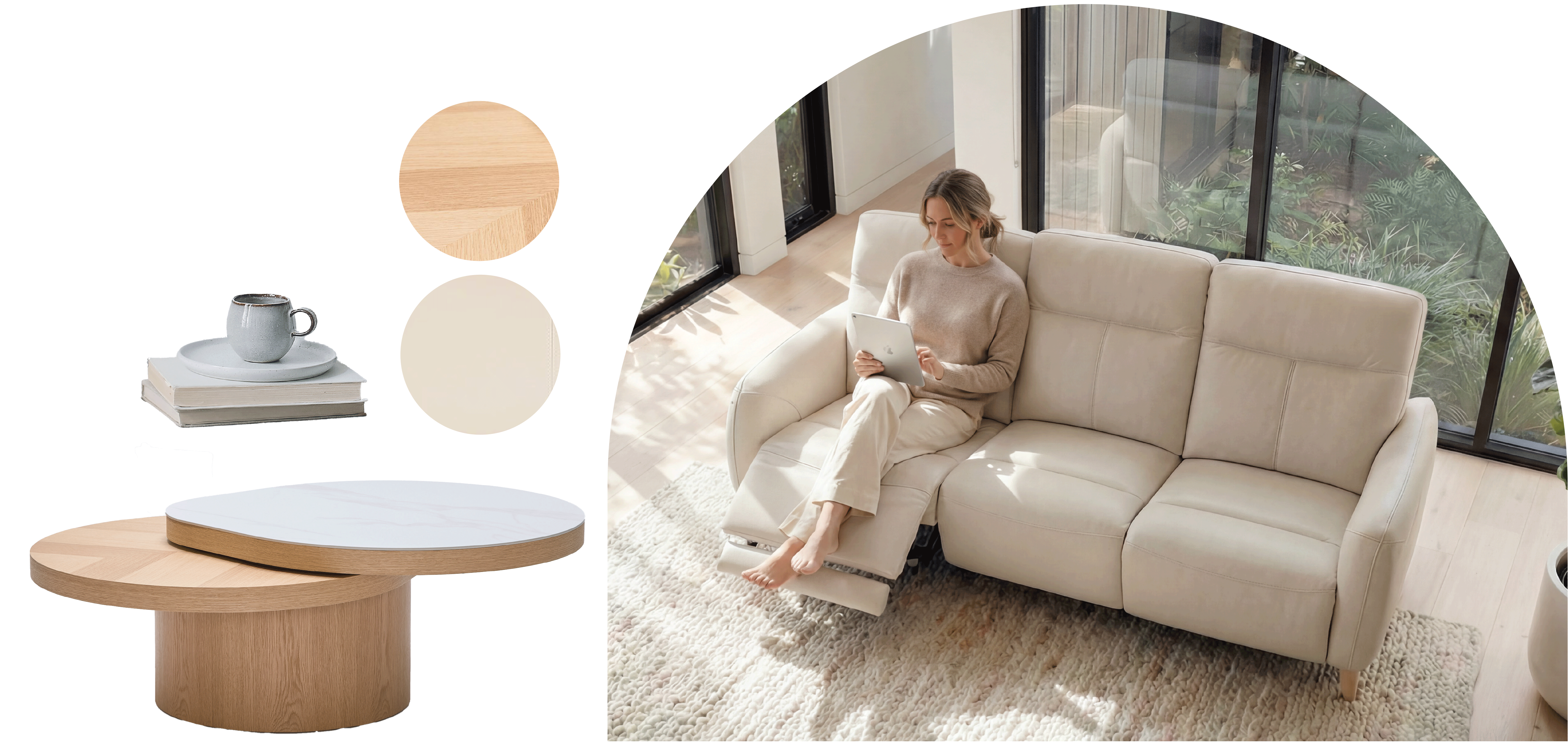 The Elyse Modular Sofa introduces a soft sage tone that creates an instant sense of ease, paired with the crisp contrast of the Aviator Coffee Table. Together, they balance comfort with structure, allowing the space to feel layered without feeling busy. Accents like the Magnus Recliner Chair add warmth through texture and form, offering relaxed functionality while maintaining a clean, cohesive look.