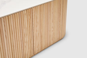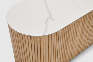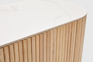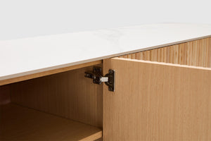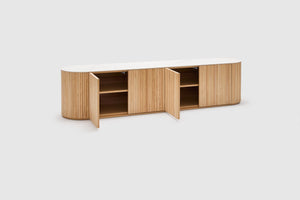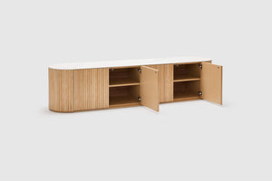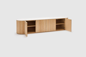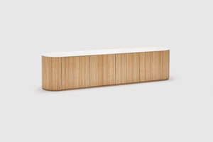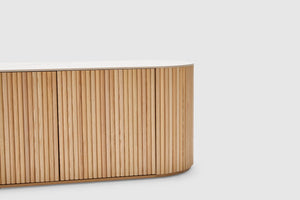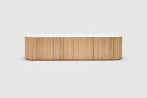 MORE CONFIGURATIONS & SIZESElevate your home with our Amelie entertainment unit. Elegantly fashioned, it features rippled natural oak timber sides and is finished with a cool matt white ceramic top. Its spacious surface offers ample curating potential. Pair with the matching pieces from the range for the complete look in your living space. Amelie is an Adriatic exclusive.