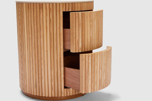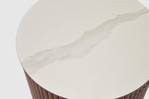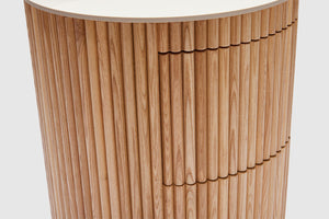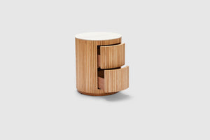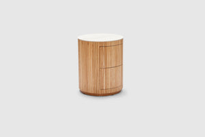 MORE CONFIGURATIONS & SIZESElevate your home with Amelie. Elegantly fashioned, it features two drawers making it ideal for storage, with rippled natural oak timber sides, and is finished with a matt white ceramic top. Pair with the matching coffee table for the complete look in your home.
