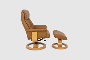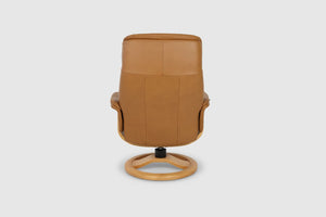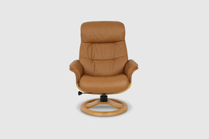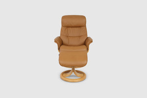 The Fjords Anne recliner chair provides continuous support for your legs and back, with bases which have a 360° swivel. The base is produced in a stained laminate wood which gives it an elegant character. Available in all our leathers and select fabrics, the Anne features maximum comfort and a manual release adjustable headrest angle. The Anne is available in two sizes, small and large