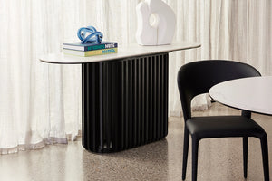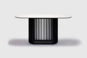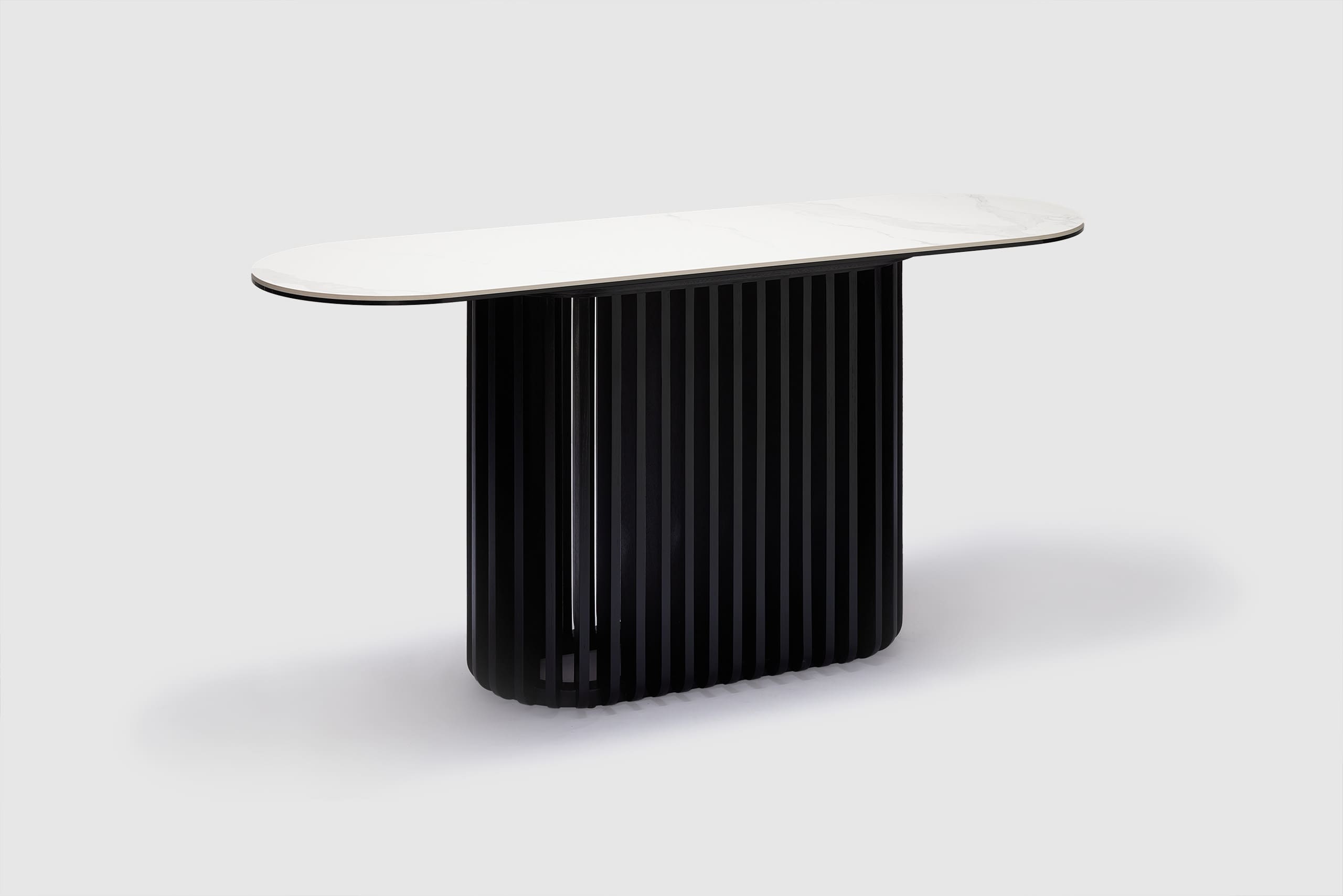 MORE CONFIGURATIONS & SIZESBobo curves mid-century modernism in a new direction, mixing cool matt white ceramic and black oak timber in a forward-thinking oval design. An oval of pristine matt ceramic tops an elliptical base of oak timber, finished in matt black. With its slatted design, this base offers a unique look and visual interest. Exclusive to Adriatic - Bobo looks sublime in any décor.