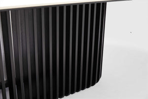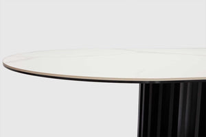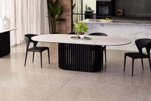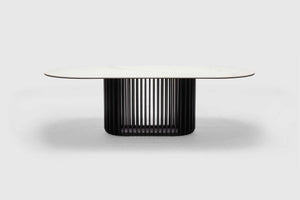 Bobo curves mid-century modernism in a new direction, mixing cool matt white ceramic and black oak timber in a forward-thinking oval design. An oval of pristine matt ceramic tops an elliptical base of oak timber, finished in matt black. With its slatted design, this base offers a unique look and visual interest. Exclusive to Adriatic - Bobo table looks sublime in any décor.