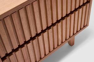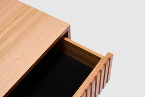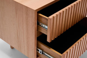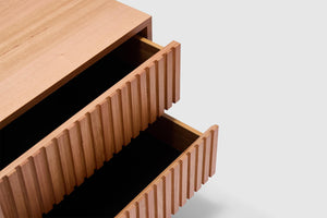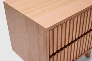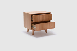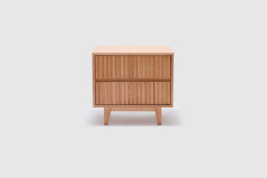 MORE CONFIGURATIONS & SIZESIntroducing our Harlow Bedside Table, the perfect solution designed to meet your organizational needs. With its two drawers, on-trend ribbed finish, and Australian messmate timber construction, this bedside table combines functionality and modern design. It's the perfect addition to any bedroom or living space where storage is a priority.