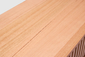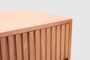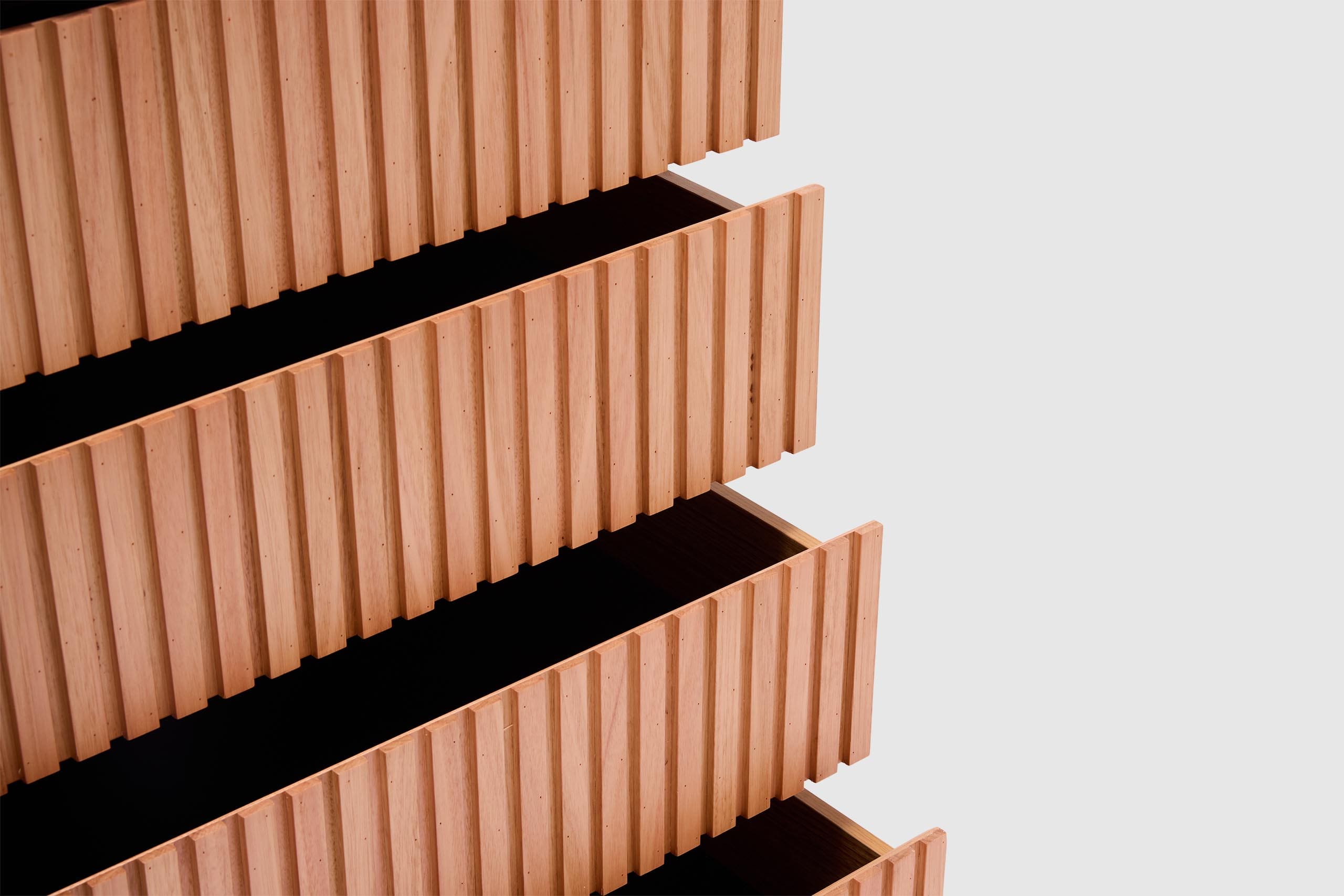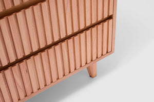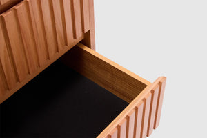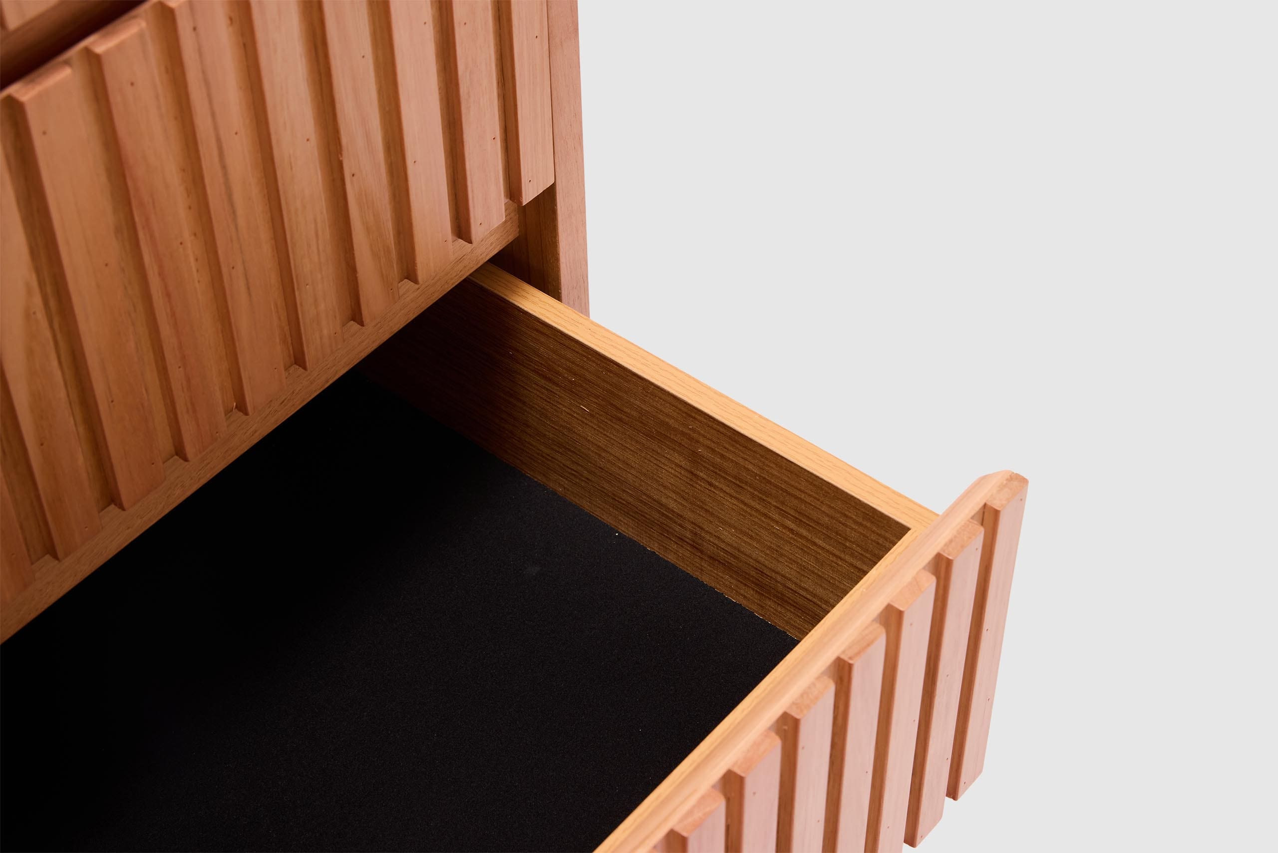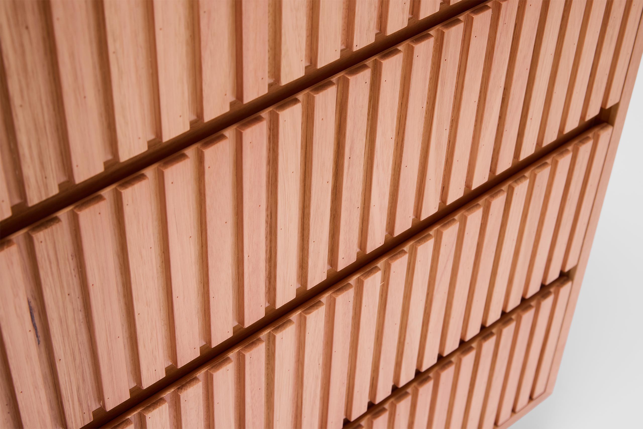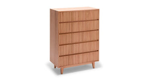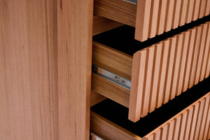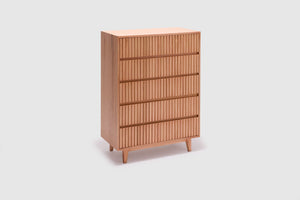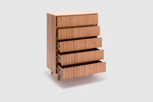 The Harlow 5 Drawer Tallboy boasts exceptional functionality and serves as an ideal choice to enhance your bedroom decor'. Constructed using Australian FSC Certified messmate timber and timber veneer, each tallboy provides durability and a distinctive ribbed design. Its natural wood tone adds a touch of style while maintaining a minimalist appeal. Meticulously crafted with a keen focus on intricate details, the full range includes matching bed, dresser, and bedside table.