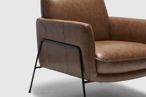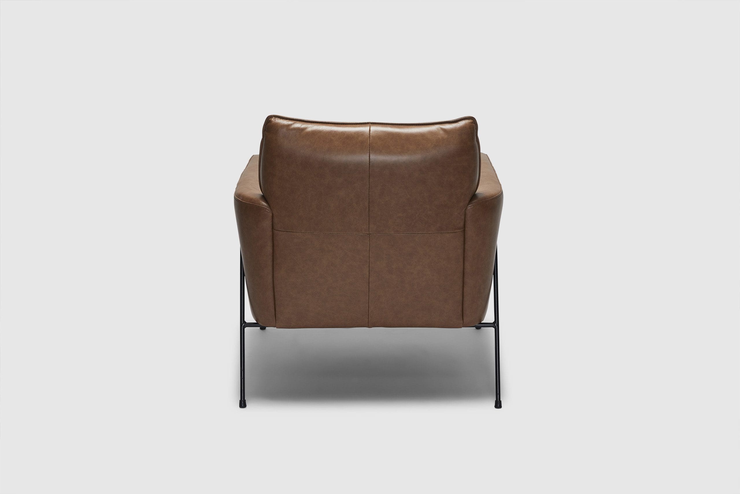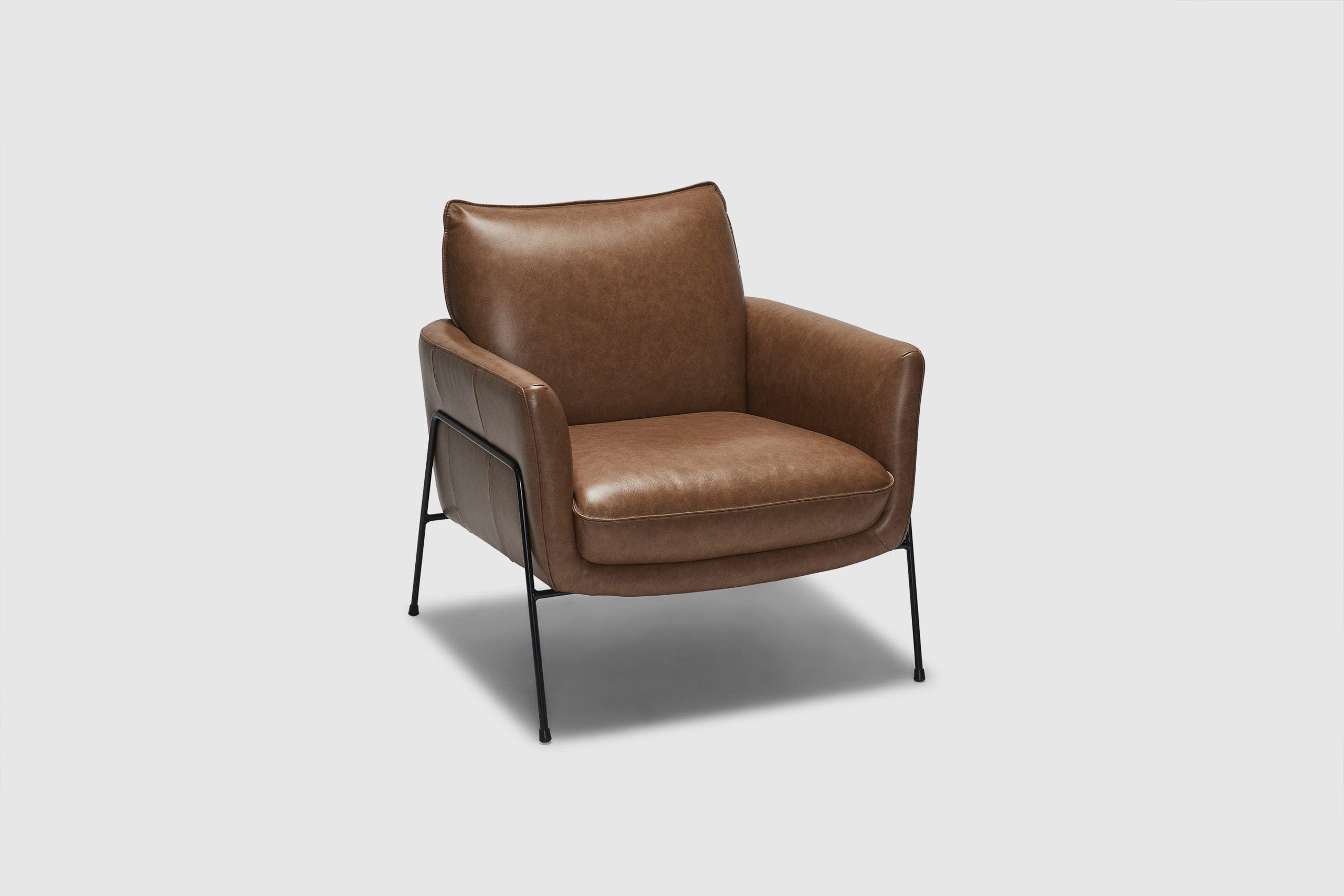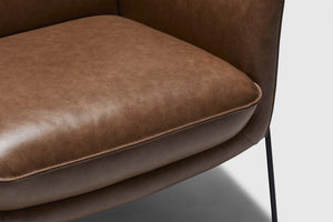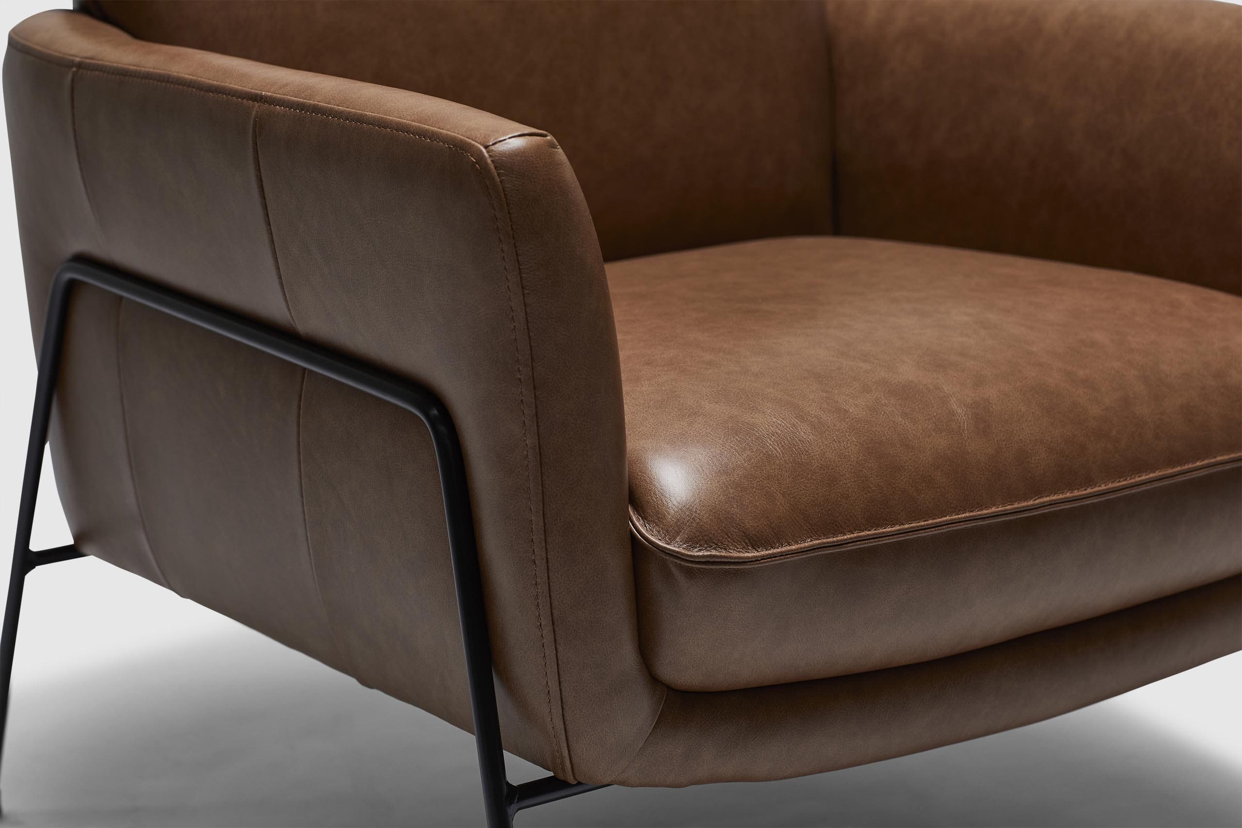 Jolene revamps the traditional leather armchair with edited curves, a tight back and a streamlined silhouette. Every bit as comfortable as it is good looking, the chair nestles a cushioned seat within its sleek yet welcoming contours. Top-grain, semi-aniline leather upholstery fits like a glove, exhibiting natural markings and rich colour making it unique to each chair. Black powder coated legs reinforce the chair's clean lines, giving it a lighter footprint.