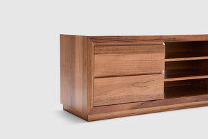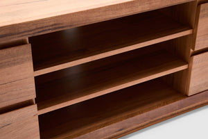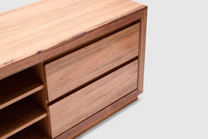 Enhance your living space with the effortless style of the Kalgoolie Entertainment Unit 196cm. The perfect piece for all your media needs, it features three shelves, four drawers and a rear outlet for convenient cable management. Crafted from Australian Marri timber, it’s the go-to spot for your next streaming session. Full range features matching dining table, credenzas, coffee and side tables.