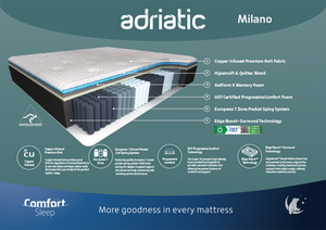 Designed and made here in Australia exclusively for Adriatic, the Milano mattress is covered in a copper infused premium knit and features a European seven-zone pocket spring system for targeted support, and advanced body contouring. Two layers of superior high density foam layers provide a smooth transition which contour to your body to relieve pressure and increase comfort with every sleep.