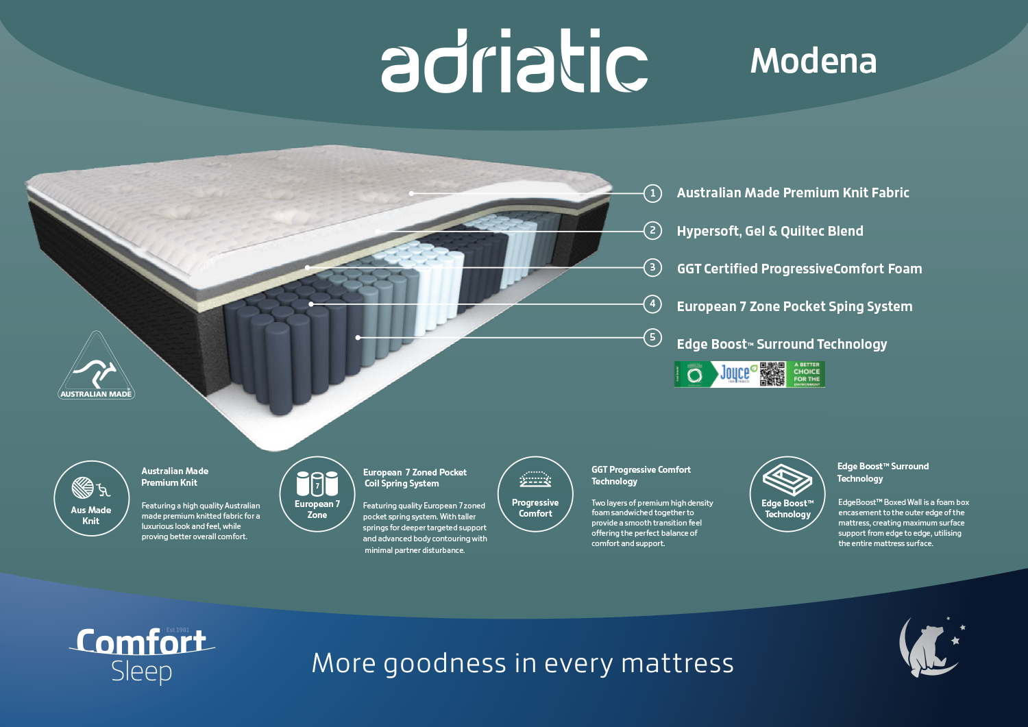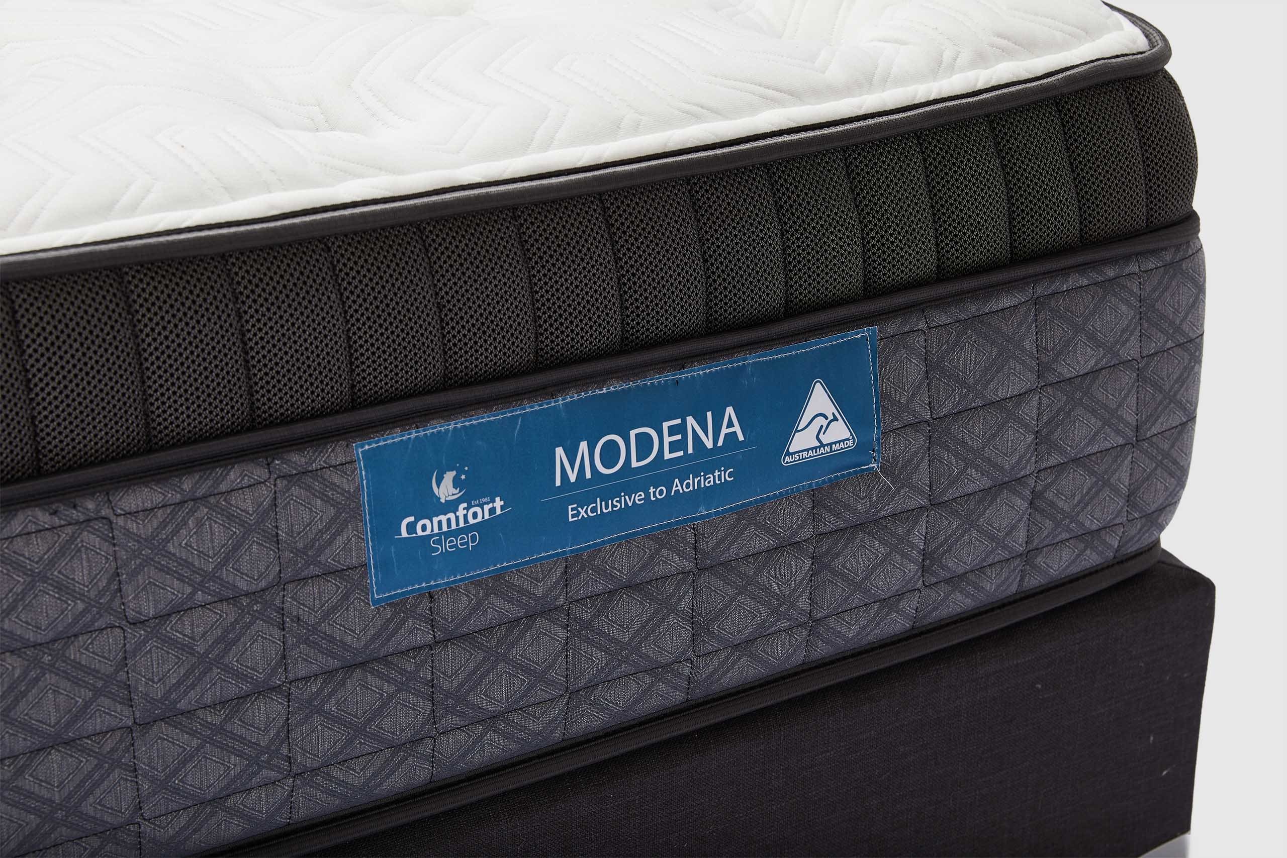 MORE CONFIGURATIONS & SIZESDesigned and made here in Australia exclusively for Adriatic, the Modena mattress features an Australian made premium knitted fabric for a luxurious look and feel, while the GCT certified layer of comfort foam provides exceptional support. The unique edge boost surround technology creates maximum surface support all night long, with the European 7 Zoned pocket coil spring system provides deeper targeted support and advanced body contouring with minimal partner disturbance.