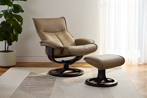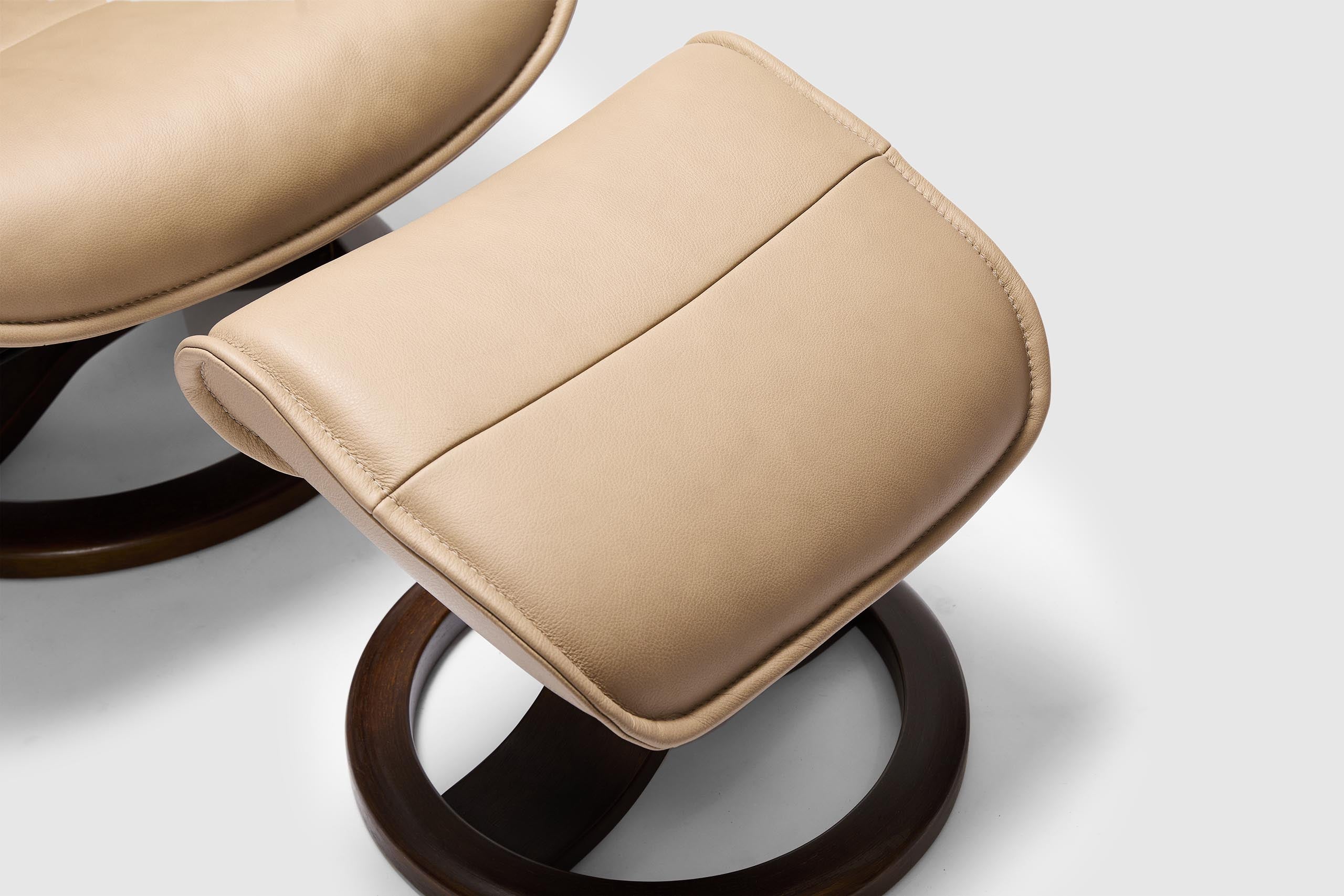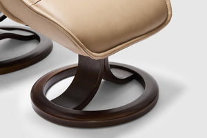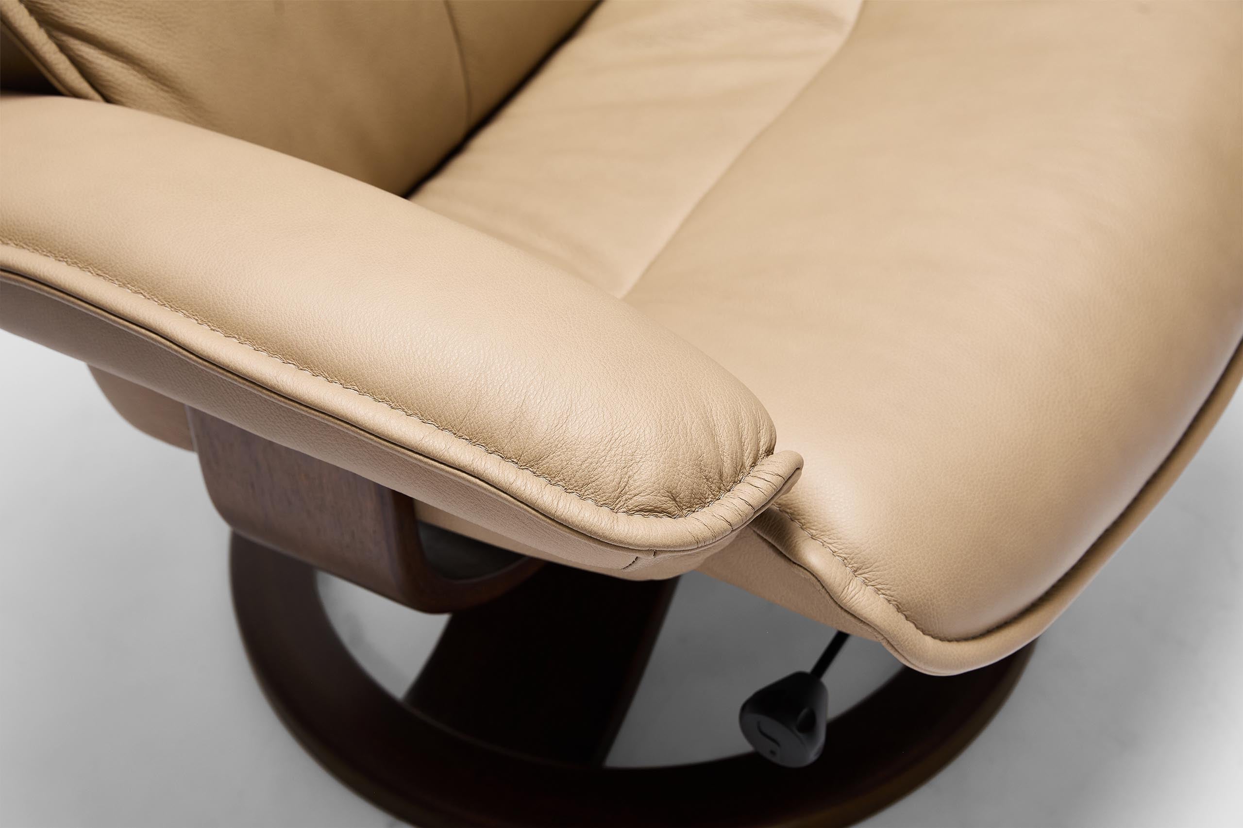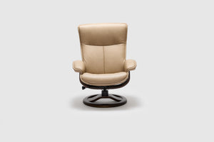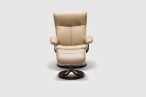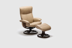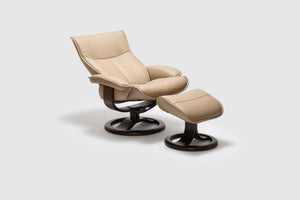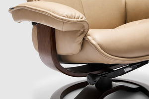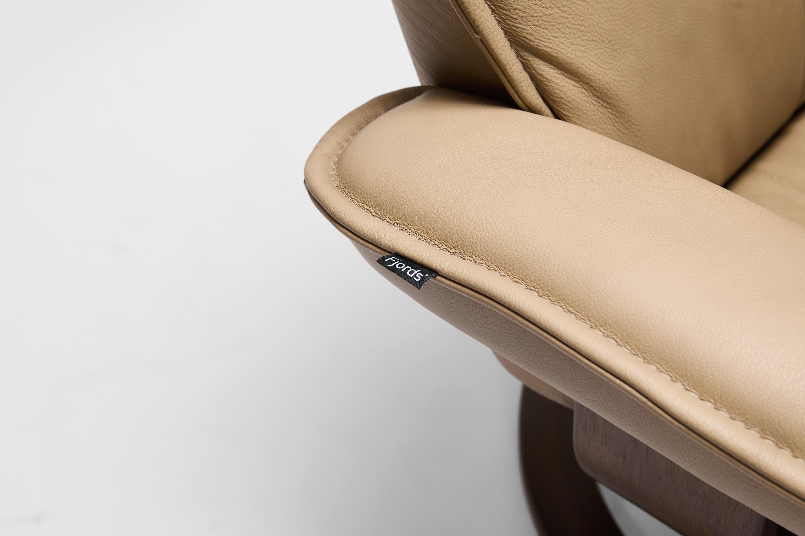 The Fjords Senator chair provides continuous support for your legs and back, with bases which have a 360° swivel. The base is produced in a stained laminate wood which gives it an elegant character. Available in all our leathers and select fabrics. Senator features a manual release adjustable headrest angle. The chair is available in two sizes, small and large.